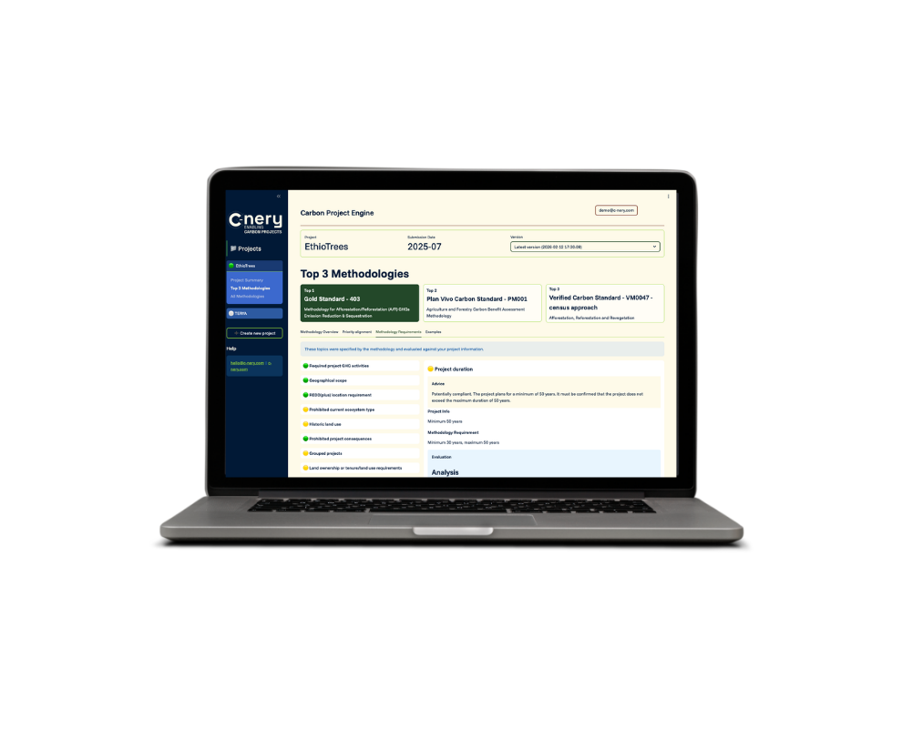 C-nery draws from a broad range of standards and methodologies used in the carbon market. We currently rely on trusted standards such as Verra, Gold Standard, Plan Vivo, BioCarbon, Cercarbono, Social Carbon, The International Carbon Registry, Silvaconsult, Label Bas-Carbone, Ecosystem Restoration Standard,... The specific methodologies considered in your Methodology Matching Report are always listed in the report you receive, so you know exactly what informed our recommendations.
